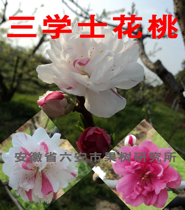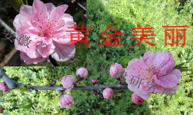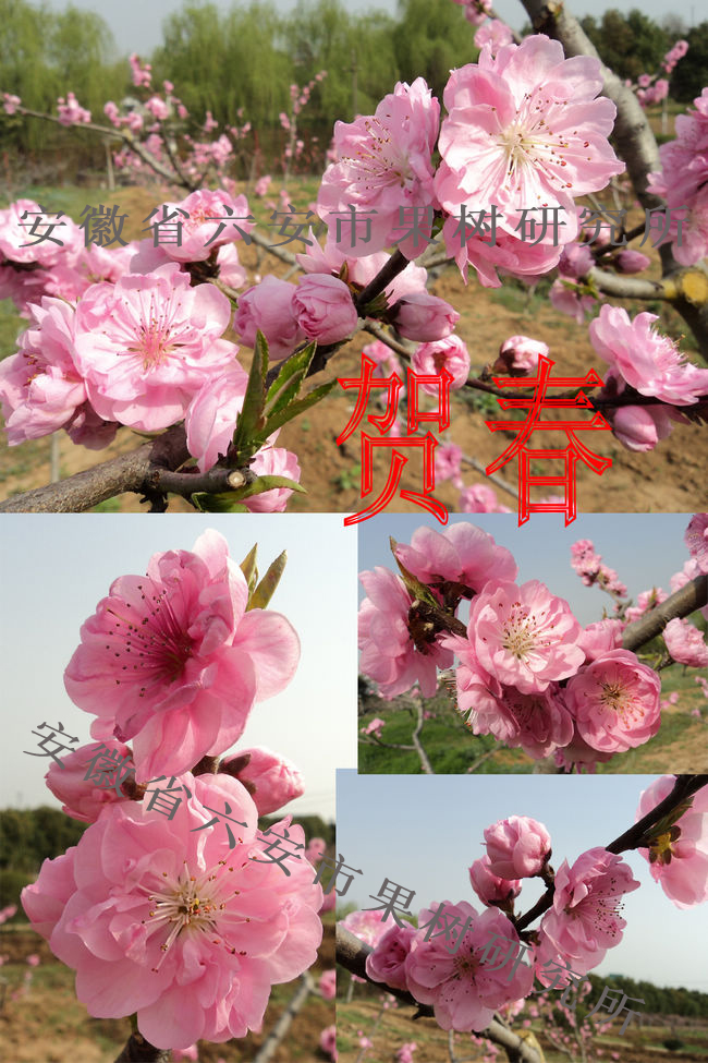 一、贺春   花粉色,重瓣,多得27枚。花径大达5厘米以上,风韵妖娆,形若牡丹。现在观花,6月尝果,果肉硬脆,味甜浓香。是观食两用桃的优良品种。