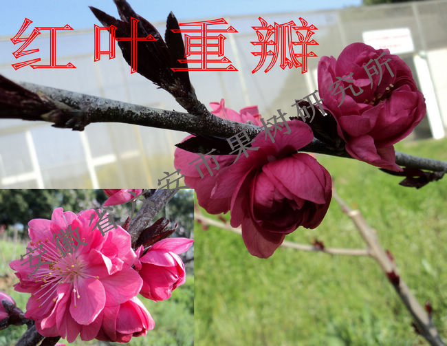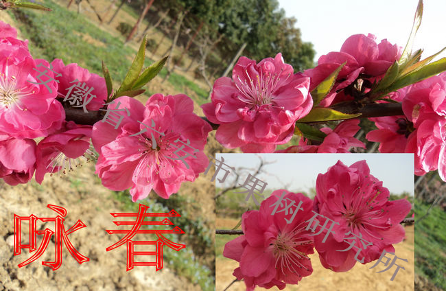 二、咏春   花红色,重瓣22枚,花径大达5厘米以上。果肉硬溶,风味浓甜。