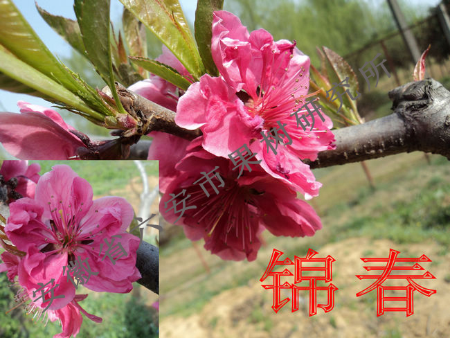 三、锦春   花红色,复瓣5-12枚。花朵大艳丽多姿。观食兼用甜油桃,果味甜香,鲜食品质优良。是观食两用桃的特色品种。