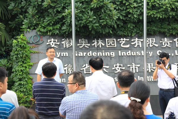 7月16日,安徽省引进国外智力成果现场会在六安召开,安徽省外专局局长潘亚群,六安市委常委、副市长束学龙,全省市人社局、外专局及农引推基地代表、媒体记者共130多人参加了会议。并冒雨实地实地考察了安徽省引智推广示范基地--奥林园艺生态园区。