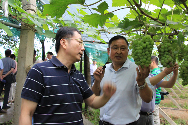 在奥林园艺生态园区,代表们首先认真听取了安徽省引智示范基地——安徽奥林园艺有限公司负责人、六安市果树研究所所长柳士勇高级农艺师关于引进国外果树品种及专家人才技术的经验介绍,并饶有兴趣地品尝了引智成果--夏之梦桃等新品种水果,接着冒雨在奥林公司引进国外品种试验研究区实地进行了考察,详细观摩了引智成果--日本夏之梦桃、日本南国红桃、夏黑葡萄和新西兰奇异果(猕猴桃)等系列优质果品示范栽植园情况,交流了引智成果及示范推广经验,与会代表对奥林园艺基地引智成果给予了充分肯定。