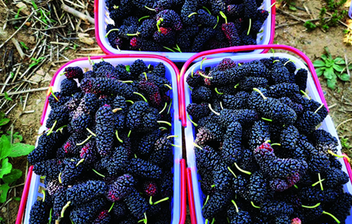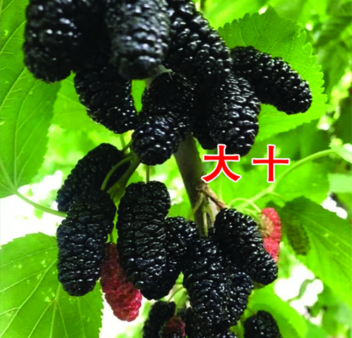 4 月底至 5 月 初成熟,补肾养身佳品。均 果重 10-15 克,是一般桑 果的 2-3 倍。坐果率极高, 果实成熟时紫黑色,柔软多 汁,含糖量 16%。头年栽苗, 次年投产,易栽易管,采果期 长达一月,是采摘园必栽品种。 是搭配紫珍珠樱桃采摘的好品种。