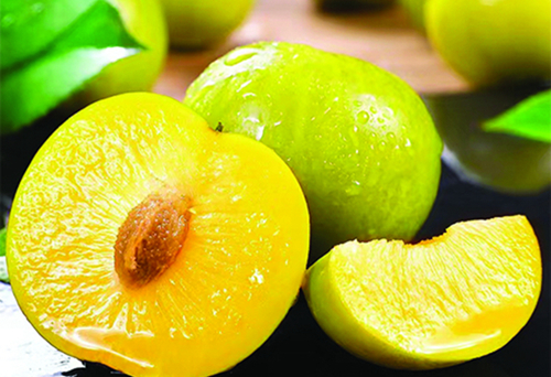 7 月 初 成 熟,果实 卵圆形, 果 面 淡 黄色,外 被蜡粉, 果 顶 一 侧微突, 缝 合 线 明显。均 果 重 38 克,大果 70 克,含糖量 16.5%,可食率 97.8%,肉 质细、清脆爽口,汁液中 多,味浓甜,离核,品质 优异。