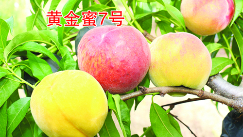 黄金蜜 7 号    5 月下旬成熟,比黄金蜜 1号早熟 7-10 天。中国农科院郑州果树所最新育成的特早熟硬肉黄桃新品种,授权奥林园艺公司推广。该品种 2023 年在六安市果树研究所 5 月 23日上市,正赶市场缺大果个黄桃的档期。单果重170-265 克,大果 422 克。果实圆形端正,果皮底色黄,不套袋着红色,风味浓甜,品质优良,含糖量 13-16%。肉质较硬,挂树时间及货架期长,耐贮运,自花结实,坐果率特高,早果丰产。引种至少 50 株起,50-499 株,8 元 / 株;500 株以上 7 元 / 株。