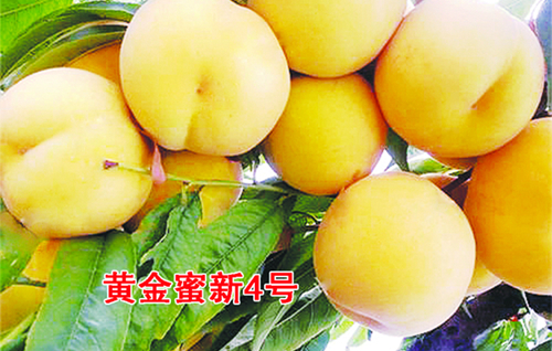 黄金蜜新 4 号    9 月上中旬成熟,晚熟黄桃品种,果形圆正,果顶平凹,均果重 270 克,大果 528 克,果肉金黄色,肉质脆硬,耐贮运,含糖量 16-18%,味甘甜,比黄金蜜 4 号更脆更甜更好吃。该品种坐果率高,丰产稳产,在长江流域和江淮地区栽培需套袋,以保持果面干净。