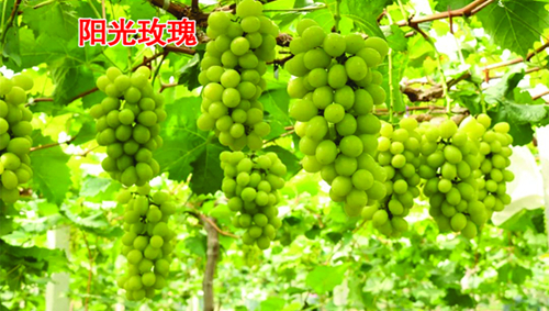 阳光玫瑰   8 月中下旬成熟,在日本被称为“晴王”,可挂树采摘到 10-11 月。栽培上 一般按照穗重 700-800 克,粒重 15-18 克,亩产控制在 1500-2000 公斤。果粒黄绿色,肉质硬脆, 含糖量 18-23%。特点:玫瑰奶油香味浓郁,果皮不酸不涩。坐果率高,抗病丰产,不裂果,耐贮运, 无脱粒现象。各项水果评比活动均荣获至高奖项,高端采摘葡萄园必栽。