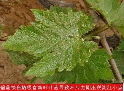 绿盲蝽又称盲蝽蟓,俗称小臭虫,半翅目、盲蝽科,杂食性害虫。以成虫和若虫通过喇吸式口器吮吸葡萄幼嫩器官的汁液。被害幼叶最初出现细小黑褐色坏死斑点,叶长大后形成无数孔洞,叶缘开裂,严重时叶片扭曲皱缩,显得粗老或畸形;花蕾被害产生小黑斑,渗出黑褐色汁液;新梢生长点被害呈黑褐色坏死斑,但一般生长点不会脱落;幼花穗被害后便萎缩脱落。绿盲蝽成虫体长5-5.5毫米,雌虫稍大,体绿色,较扁平;头三角形,黄褐色;复眼红褐色;触角淡褐色;前胸背板多微细黑色刻点;前翅绿色。若虫黄绿色,密生黑色细毛;复眼灰色。