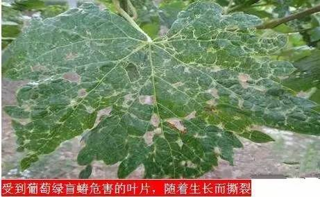 葡萄绿盲蝽在葡萄上主要危害叶及幼果,吸食新叶汁液导致叶片先期出现淡红小点,随着叶片扩大而撕裂,吸食幼果汁液,使果面产生黑褐色斑点,抑制果膨大。如遇持续潮湿会导致果实产生溃疡。