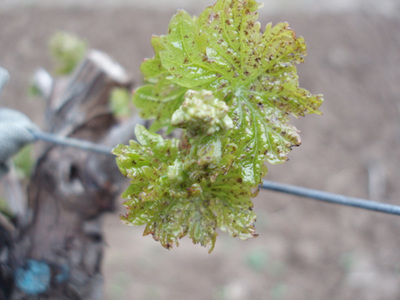 葡萄新梢嫩芽被刺吸后变干枯。嫩叶受害后,出现黑色小点,随着叶片生长,形成不规则孔洞,叶片萎缩不平,残缺畸形。花蕾受害后即停止发育并干枯脱落,受害幼果初期表面呈现不规则的黑点,随着果实膨大,黑点变为褐色和黑褐色,形成不规则的疮痂,少数果实在疮痂处开裂。