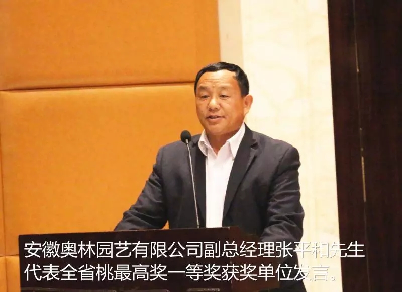 这次获得全省优质果品展评活动一等奖还有另外三家,共四家果树企业。在近日举行的隆重的颁奖典礼上,安徽奥林园艺有限责任公司副总经理张平和先生代表全省桃鲜果最高奖一等奖获奖单位发表了讲话。