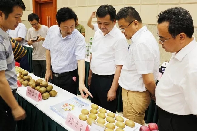 省农委主任陶方启(右二)、副主任陈卫东(右三)、朱永东(右四)在省农科院院长、省果树体系首席专家徐义流(右一)的指引下观看奥林公司选送的猕猴桃